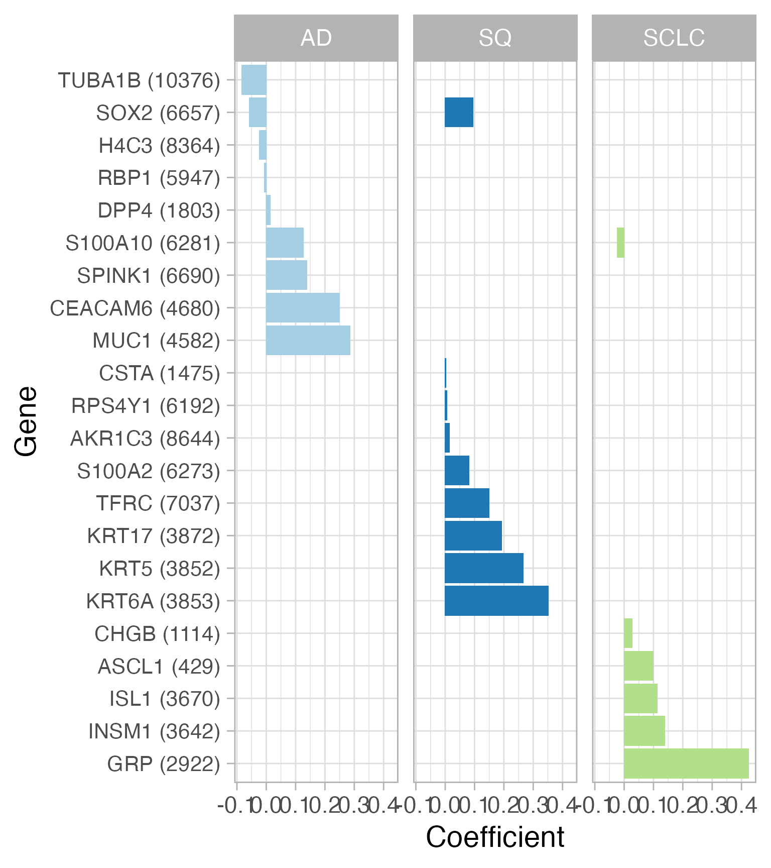 Let’s look at the coefficients for the best model from cross-validation (ignore the warning about “Stacking not well defined…”). This plot shows which genes are used to predict lung cancer subtype. For example, increased expression of any of three keratins (KRT17, KRT5, KRT6A) increases the probability that a sample is SQ. The number in parentheses next to each gene symbol is the Entrez gene ID.